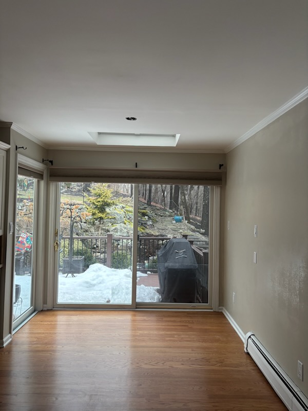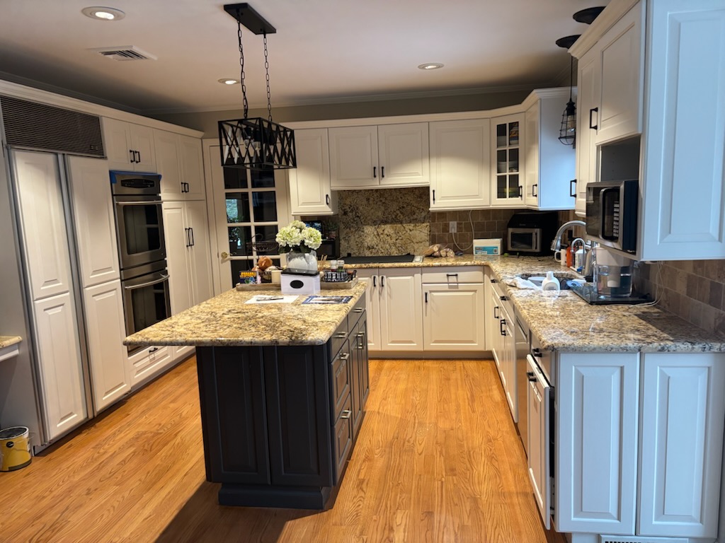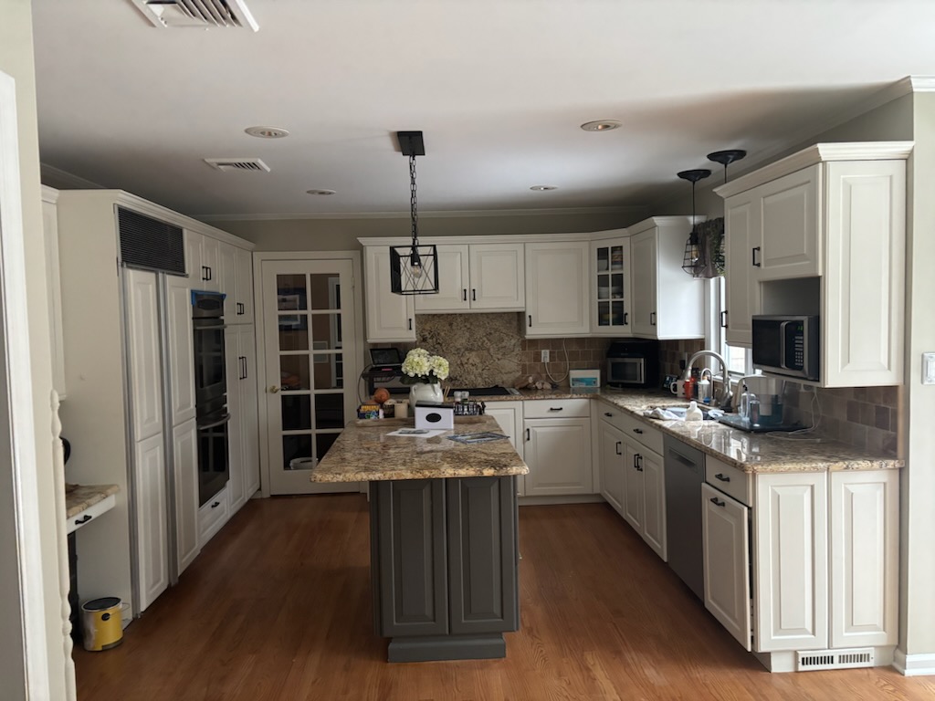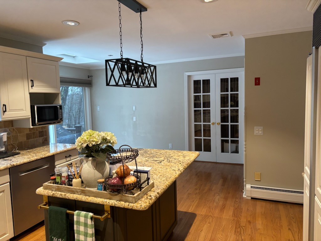 Repair of sheetrock damage by ice damming and interior residential painting of kitchen area ceilings and walls in Boonton NJ.