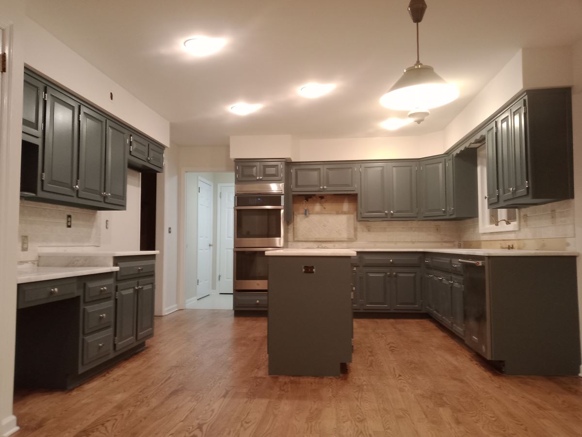 Refinishing of kitchen cabinets over old dark stain and polyurethane. Application of one coat of oil primer followed by two coats of an oil base Advance paint by Benjamin More.